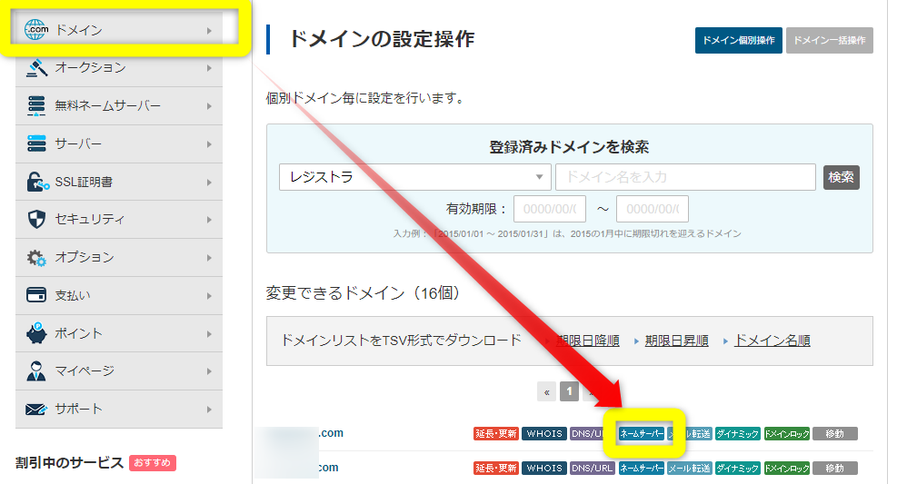 ドメインを管理しているところでネームサーバーを変更します