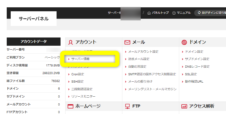 まずシンサーバーのサーバーパネルにて『サーバー情報』をクリック