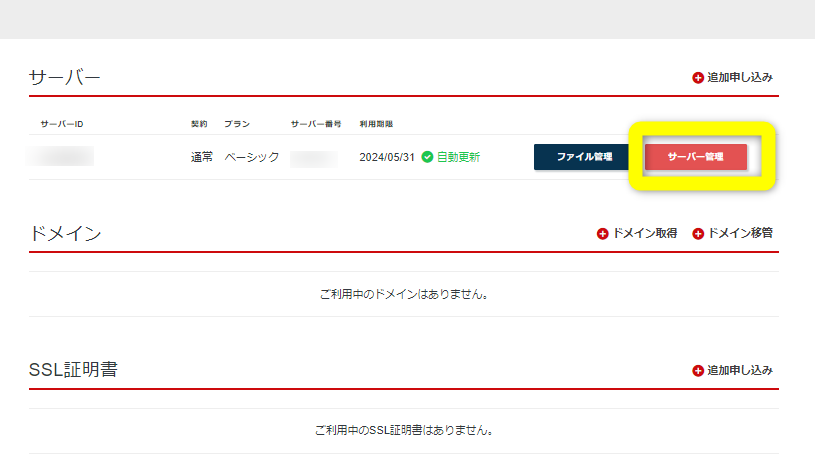 サーバー開設後、ログインしたら『サーバー管理』をクリック
