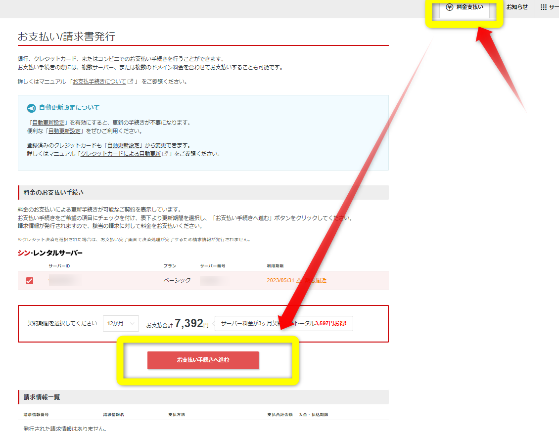 『料金支払』から『お支払い手続きへ進む』で支払いを完了させます
